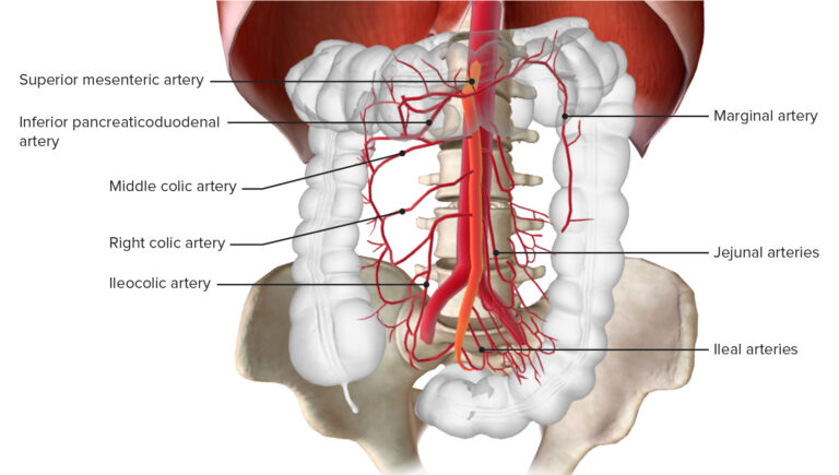 Acute mesenteric ischemia occurs when there is an abrupt interruption of blood flow through these arteries, most commonly the SMA, leading to ischemia of the bowel. The rapid loss of oxygen and nutrients causes mucosal injury, transmural infarction, and if untreated, bowel necrosis and perforation.